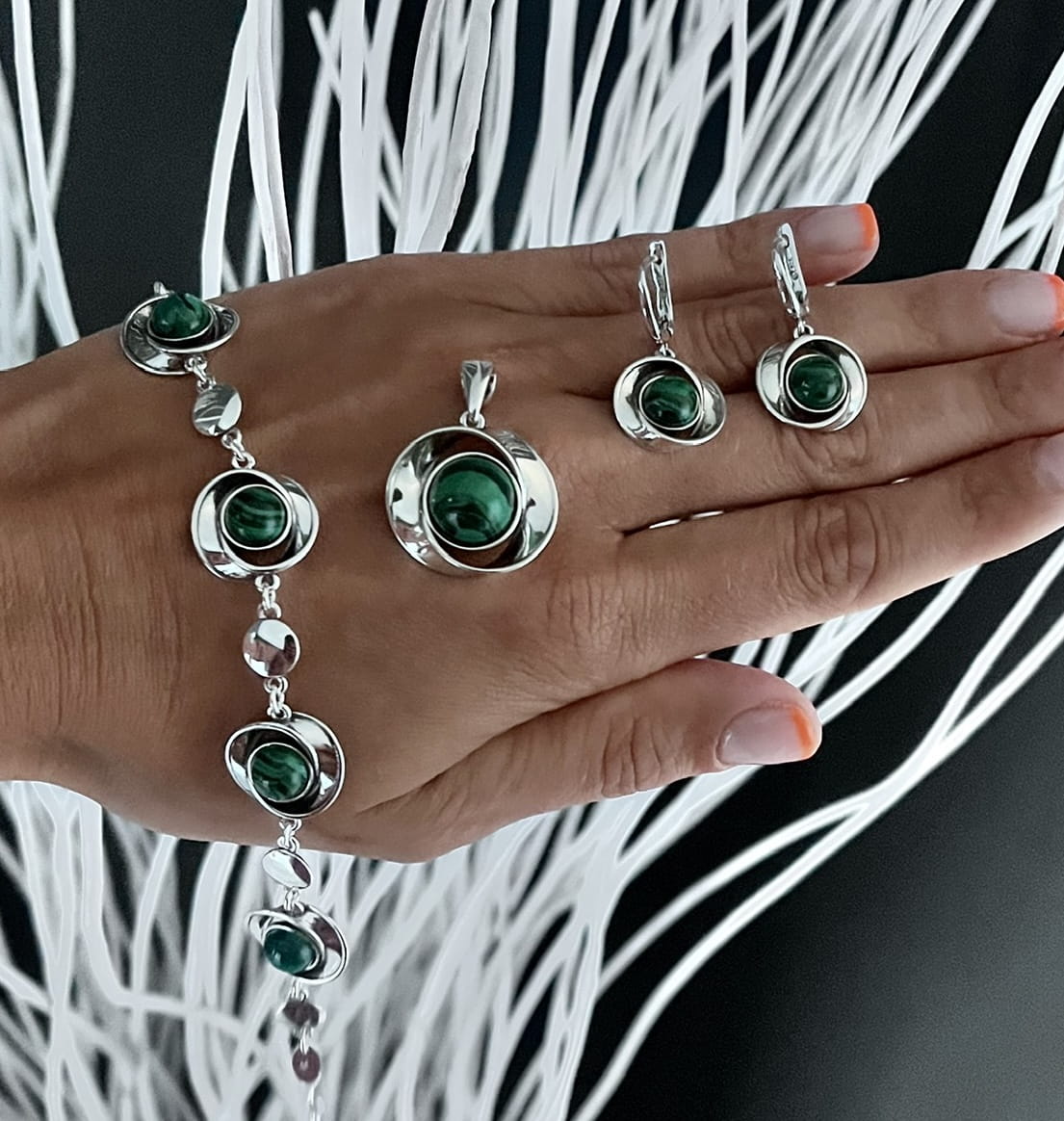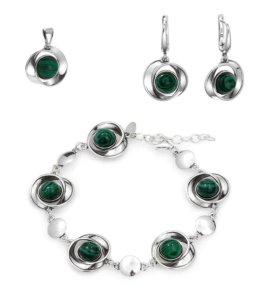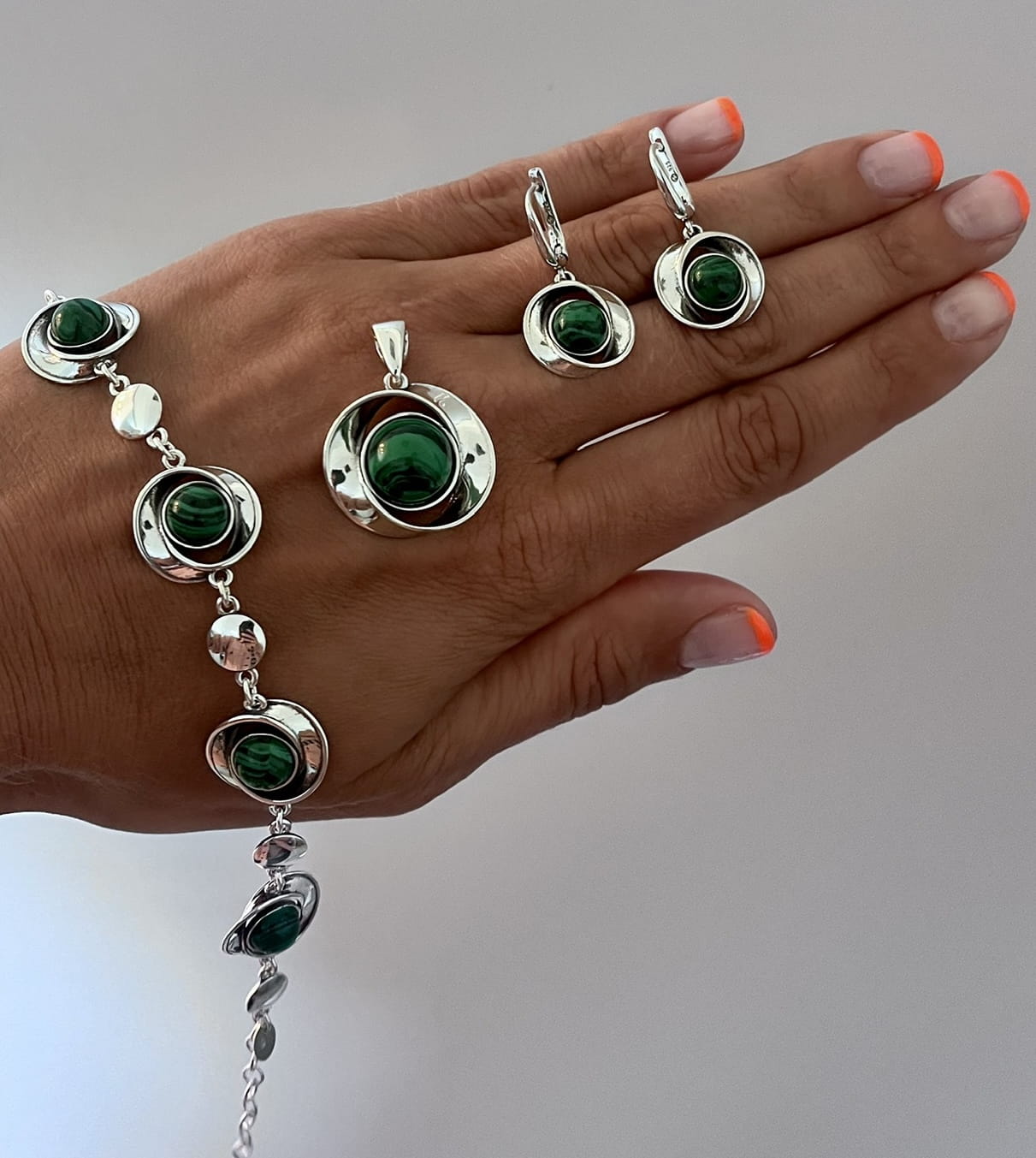 Wprowadź do swojej kolekcji biżuterii odrobinę natury i elegancji z naszym kompletem srebrnej biżuterii z zielonymi kamieniami – Malachit.