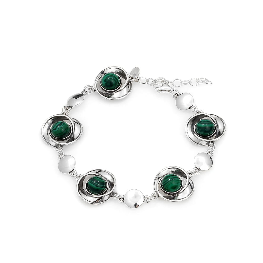 Srebrna bransoletka z motywem kwiatów ozdobiona pięknymi zielonymi kamieniami jubilerskimi - Malachit