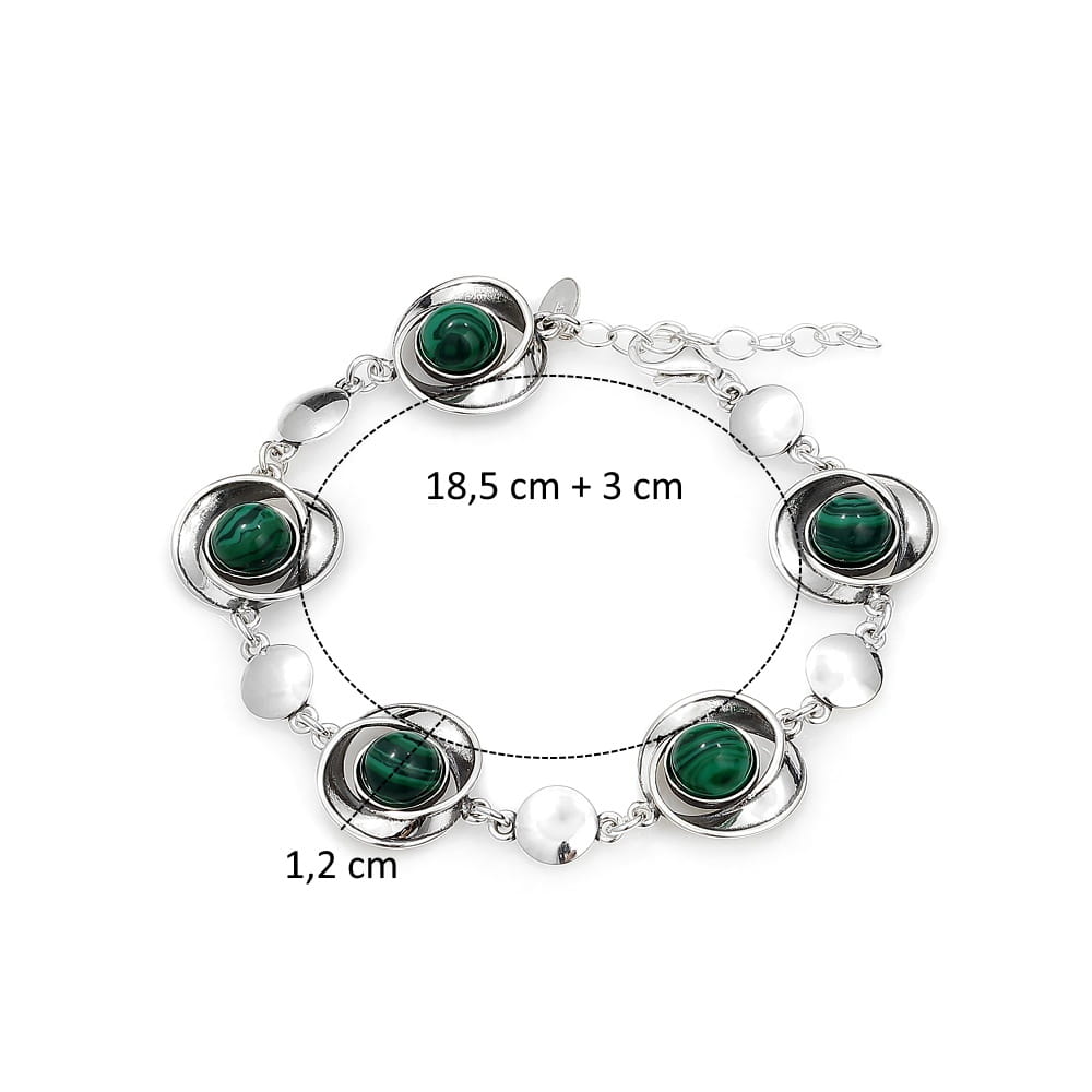 Kolczyki z solidnym zapięciem angielskim są wygodne i bezpieczne w noszeniu, idealnie uzupełniając resztę zestawu. Bransoletka delikatnie oplata nadgarstek, dodając elegancji każdemu ruchowi, a zawieszka z zielonym malachitem stanowi stylowy akcent, który podkreśli każdą stylizację.