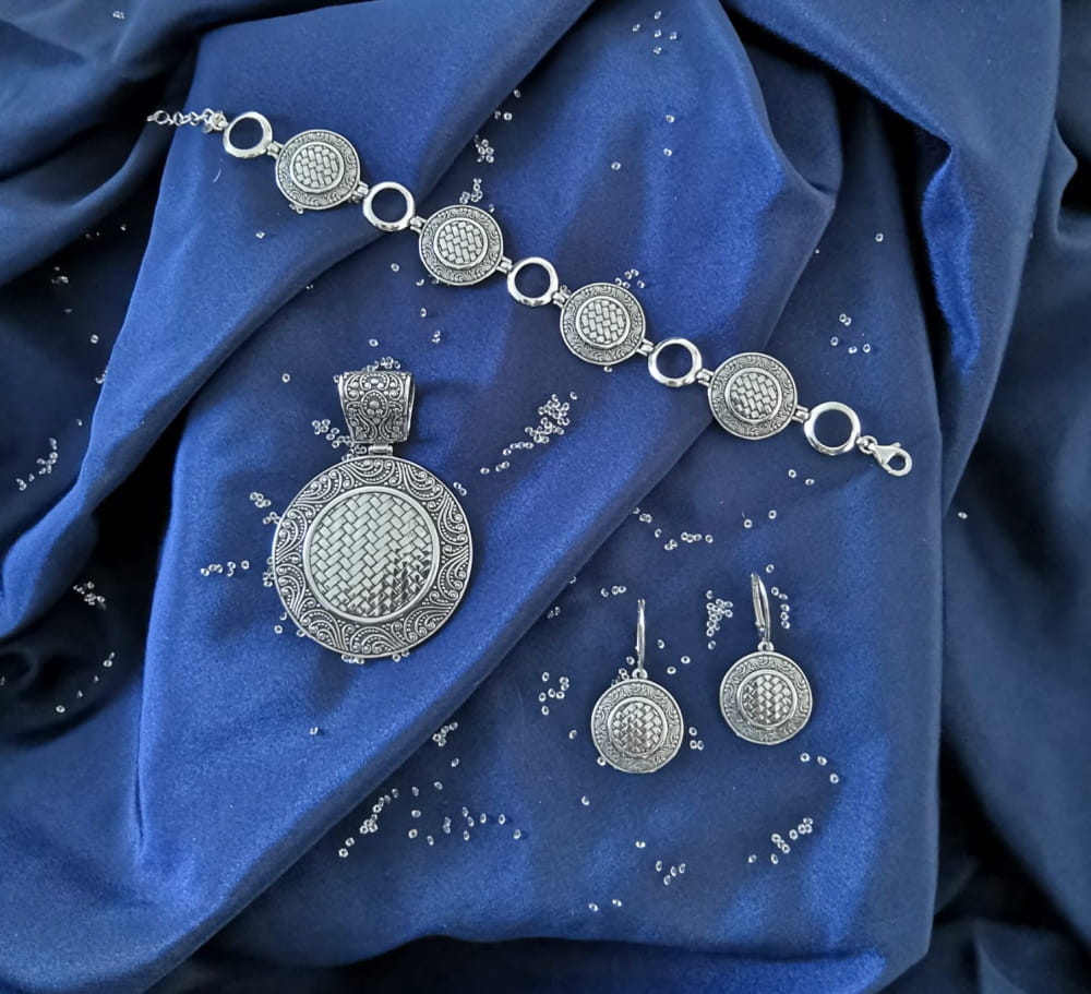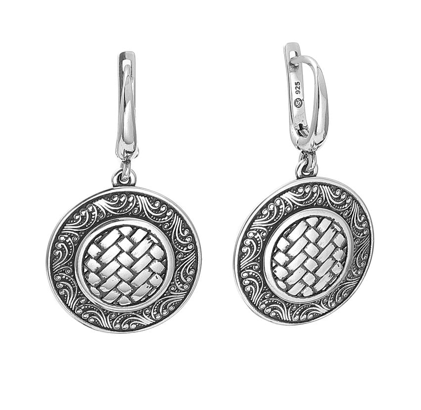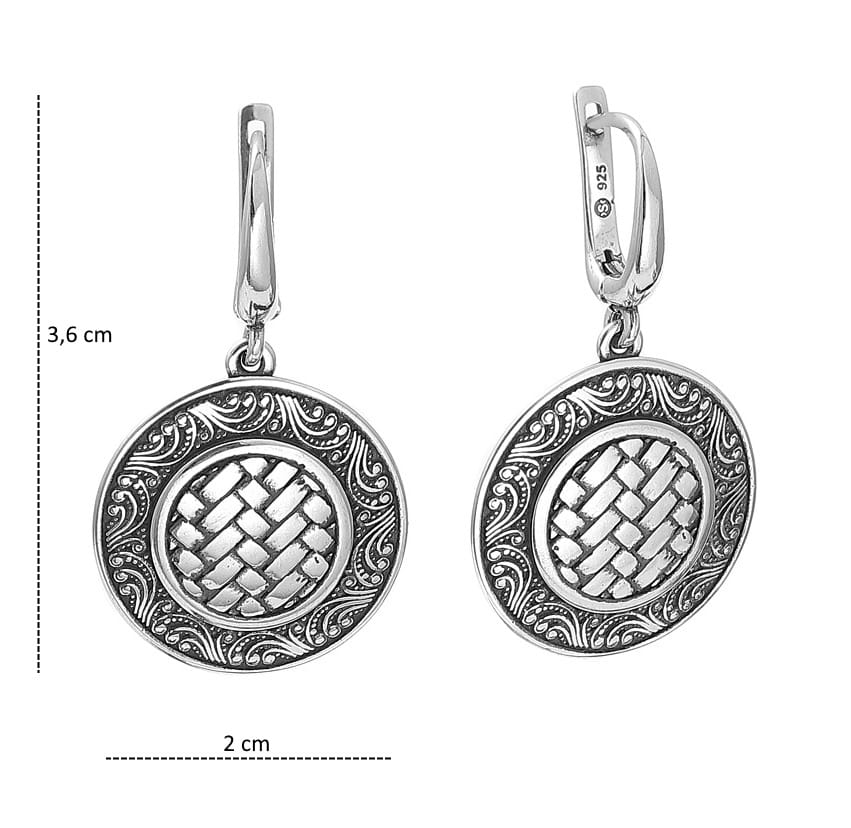 Wyjątkowe kolczyki wykonane z najwyższej próby srebra 925 to prawdziwy kunszt jubilerski łączący etniczny charakter z klasyczną elegancją. Centralnym elementem biżuterii jest misternie wykonany, wypukły wzór o strukturze plecionki, który został otoczony dekoracyjną ramą z roślinnym ornamentem pełnym subtelnych zawijasów. Całość poddano procesowi profesjonalnego oksydowania, co nadało srebru szlachetny, lekko postarzany odcień i wydobyło najdrobniejsze detale grawerunku, tworząc efektowny kontrast światłocienia.